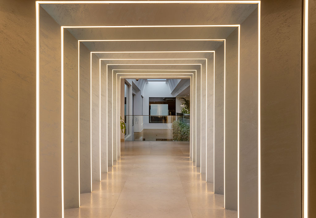 One of the standout lighting elements of the scheme is a series of illuminated tunnels linking the different sections of the building. Lines of light frame the architectural fins in the walkways to create a continuous flow of light that changes the pace and heightens the experience. The effect is purposely immersive, helping to evoke a sense of discovery and pull occupants through to their destination.