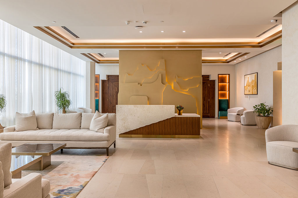 A similar example of how light and architecture work symbiotically to elevate the design is evident in the reception area but executed on a smaller scale. Diffuse lines of light highlight the contours of an artistic wall panel behind the desk that depicts the outline of buildings carved into the landscape. The effect is subtle yet beautifully realised, lending warmth to the sand-hued surface and depth to the overall design.