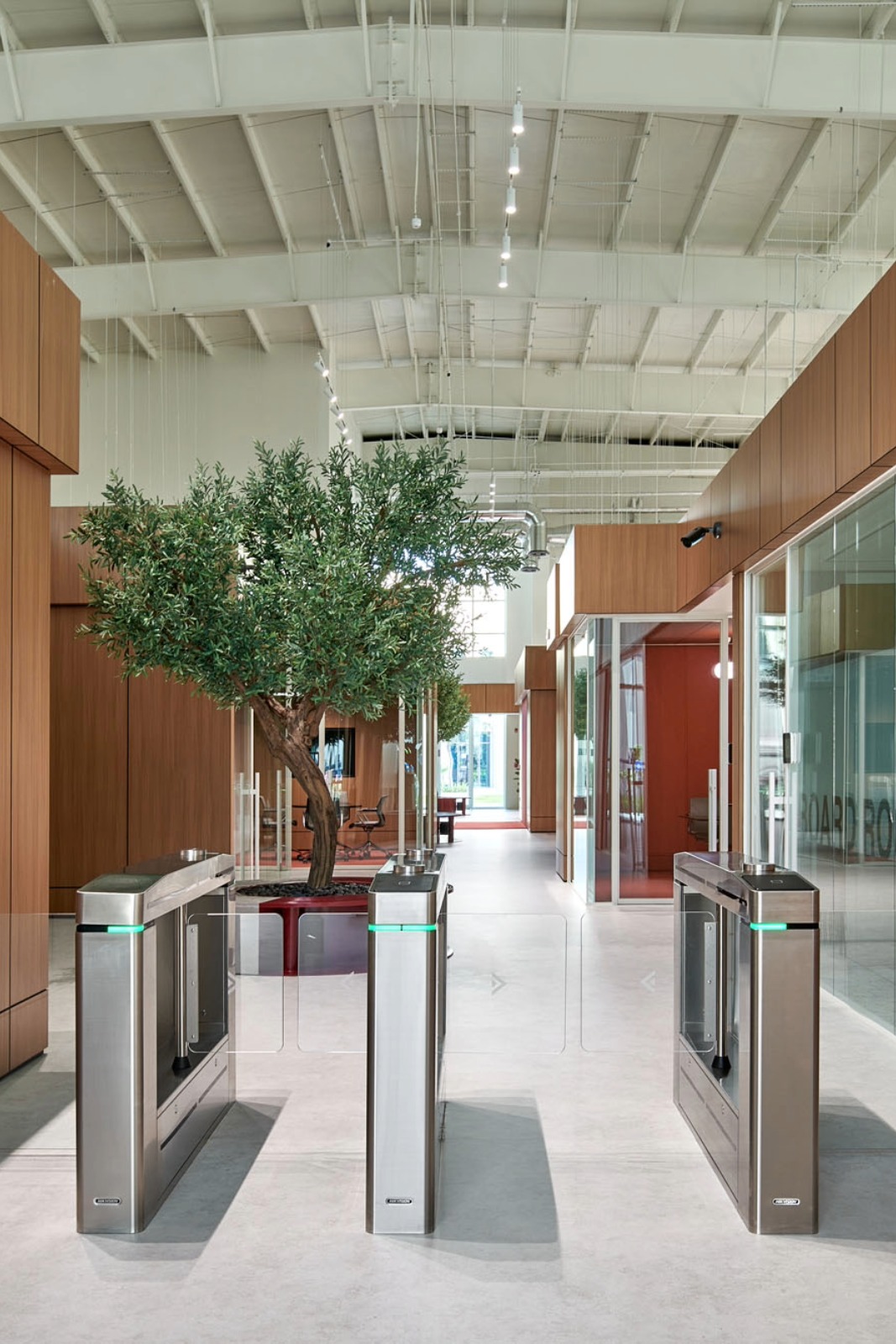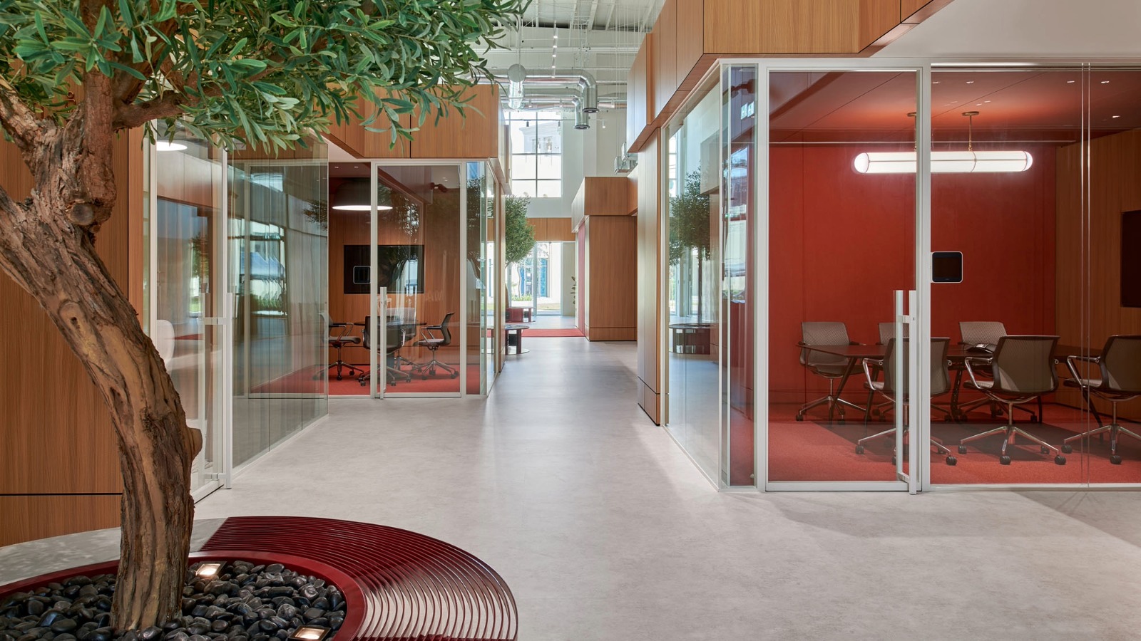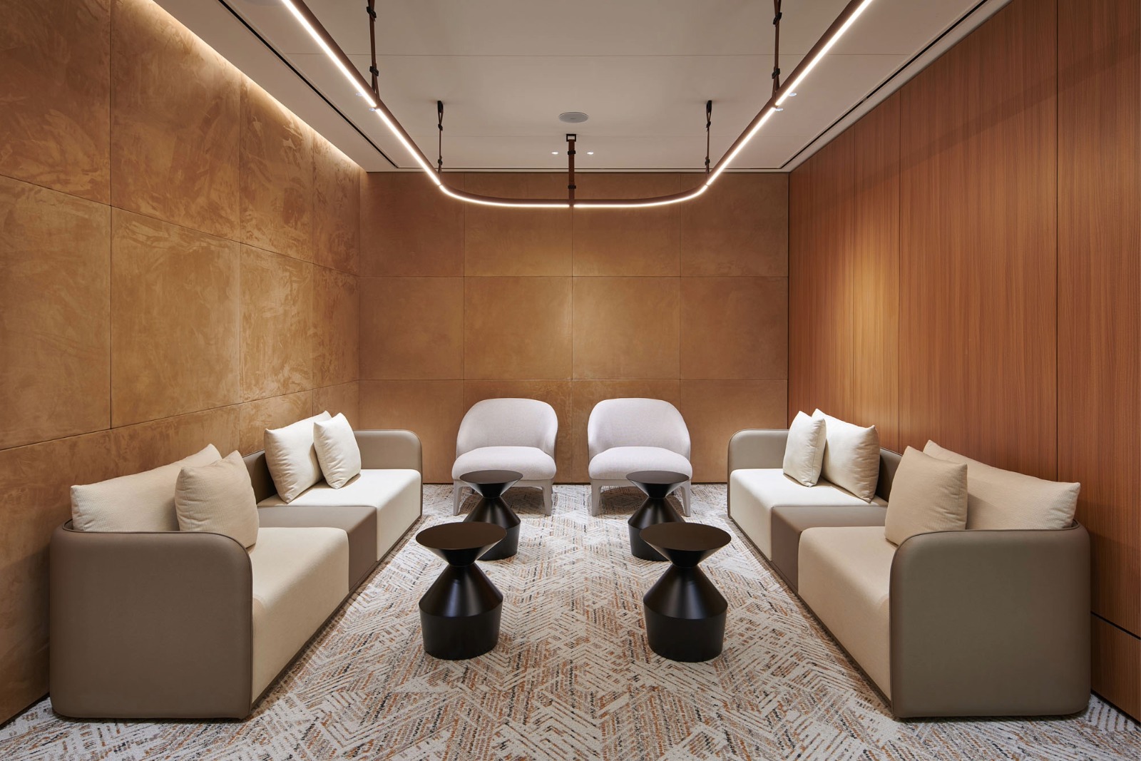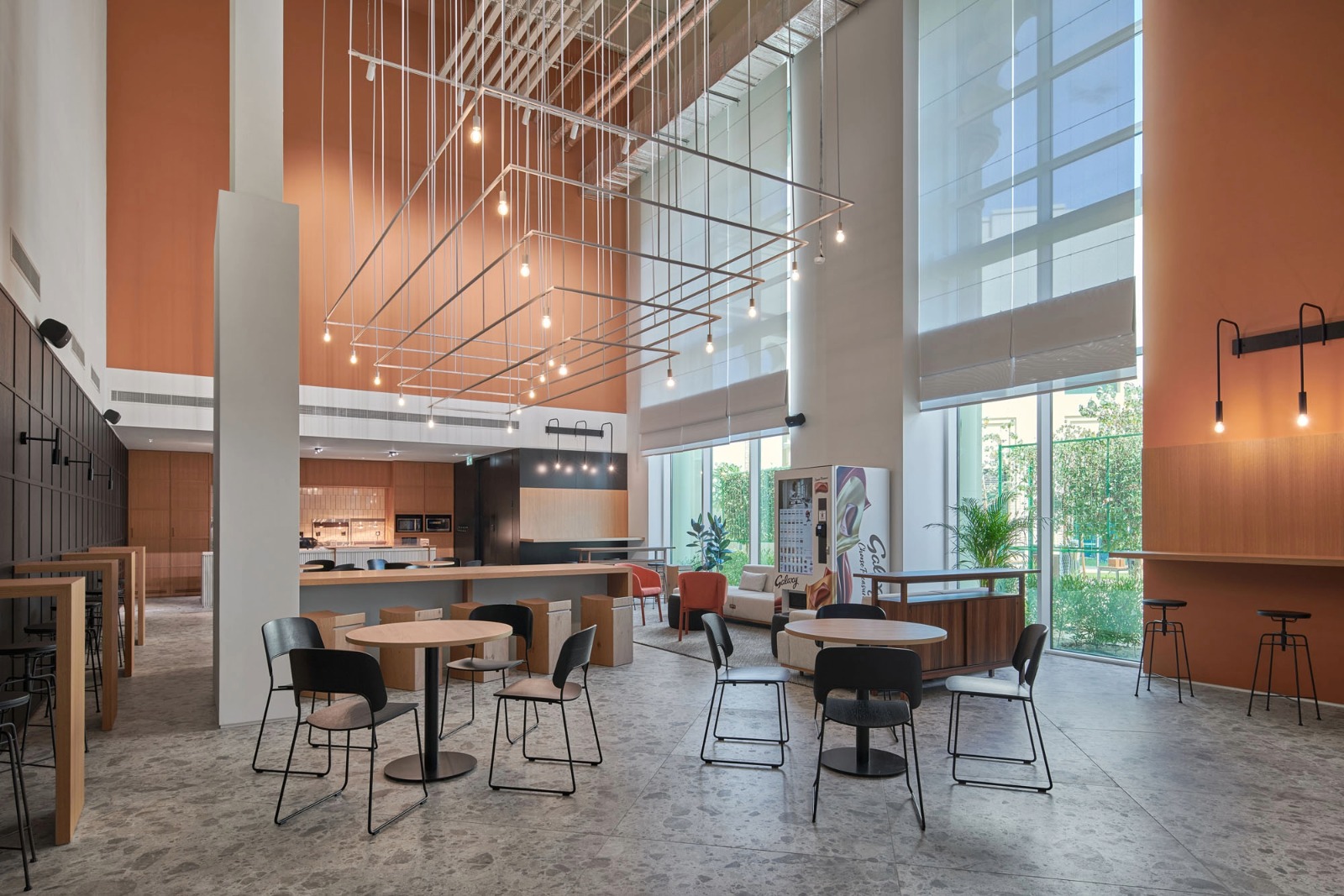The central atrium serves as a vibrant hub that accommodates a variety of working styles through casual breakout areas and enclosed meeting rooms. To preserve the industrial character of the double-height space, a suspended track and spotlight system was integrated below the ceiling, producing a subtle layer of ambient light without any structural intervention. At a lower level, a softer lighting language was achieved through a combination of flush-mounted downlights and decorative pendants.