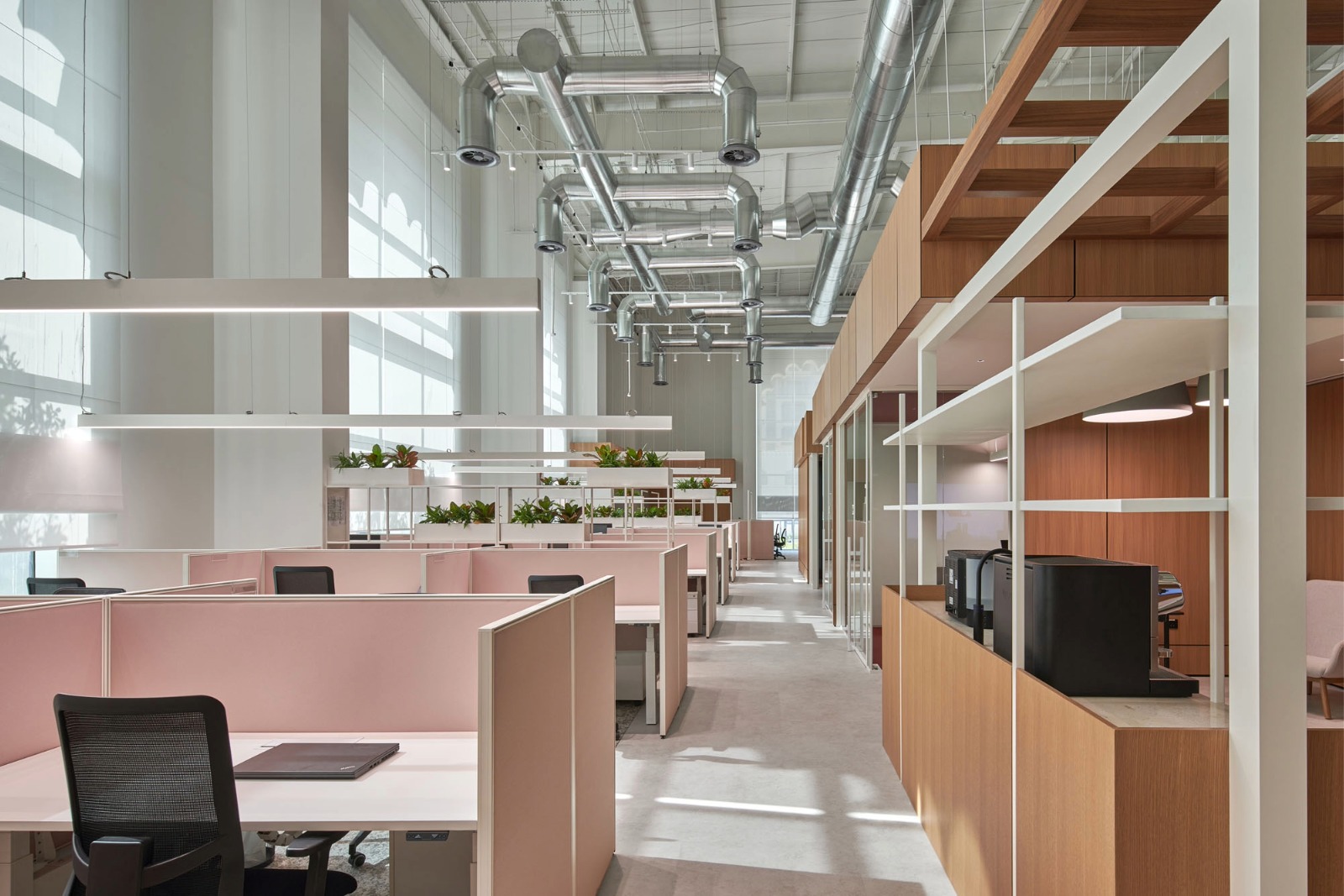 Exposed industrial pipework is a defining feature within the open-plan work zones. We navigated this important structural element by introducing the same track and spotlight system used in the communal areas. Suspended linear fixtures were then installed above the desks to provide functional task illumination.