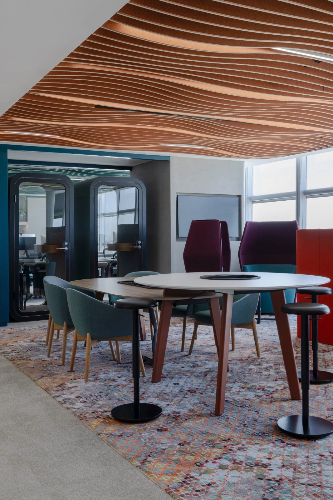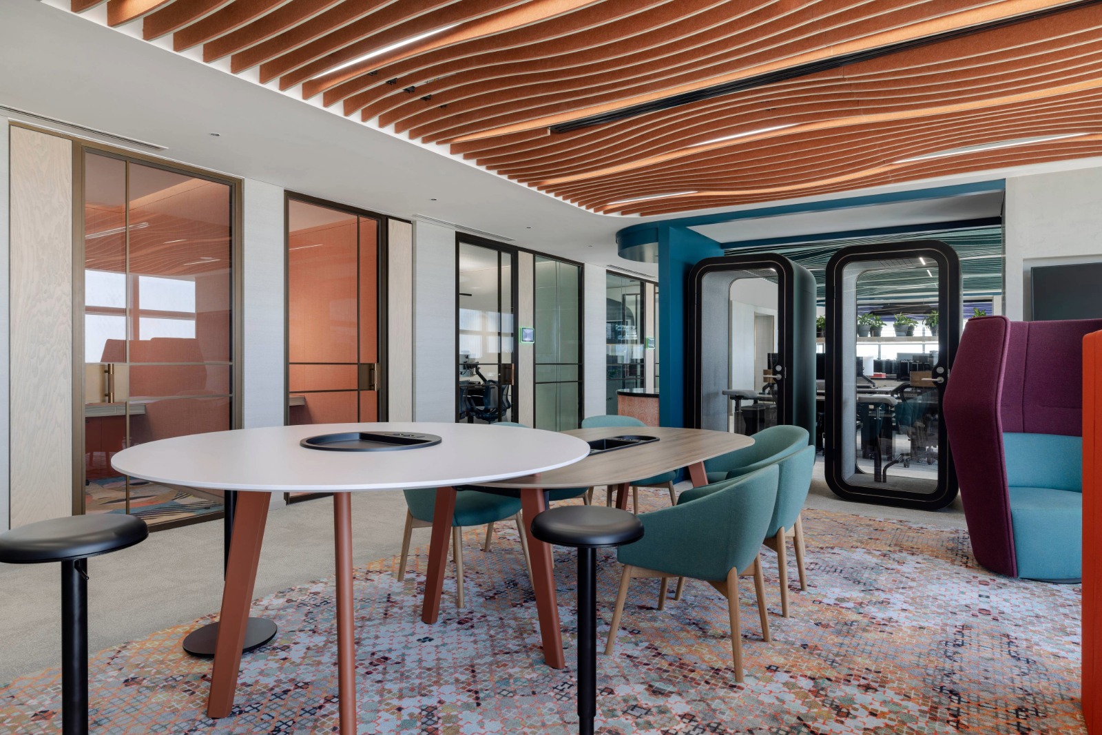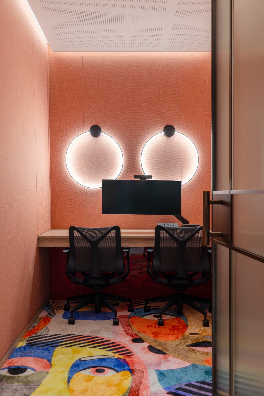 The lighting is dialled down and human-scale to support focus and recharging. Low-level illumination offers visual comfort, wall-mounted ring lights produce ideal lighting for video calls, and acoustic pendants minimise noise for a distraction-free environment.