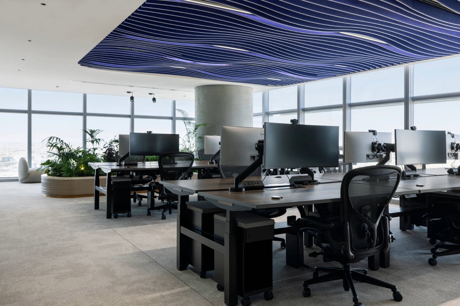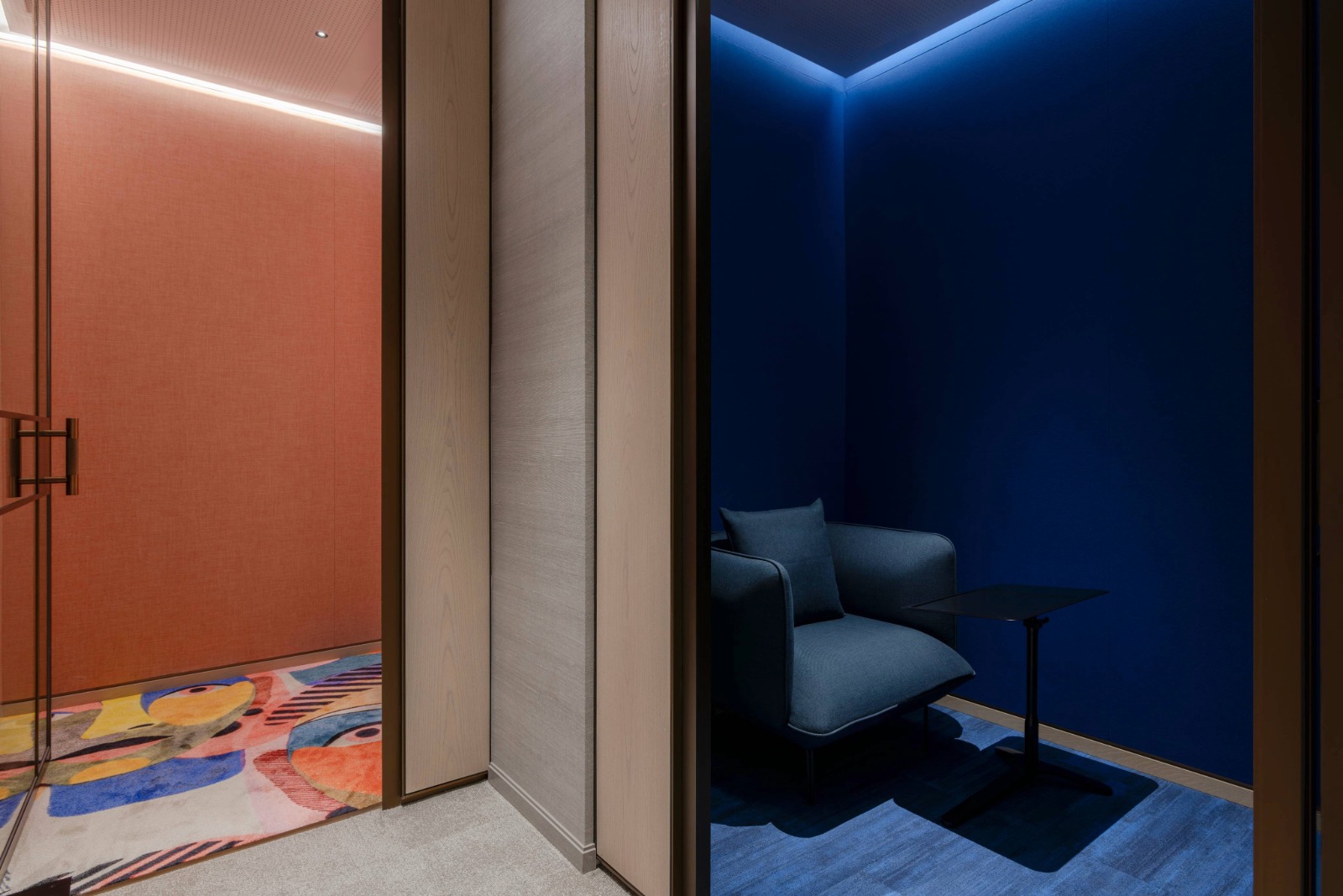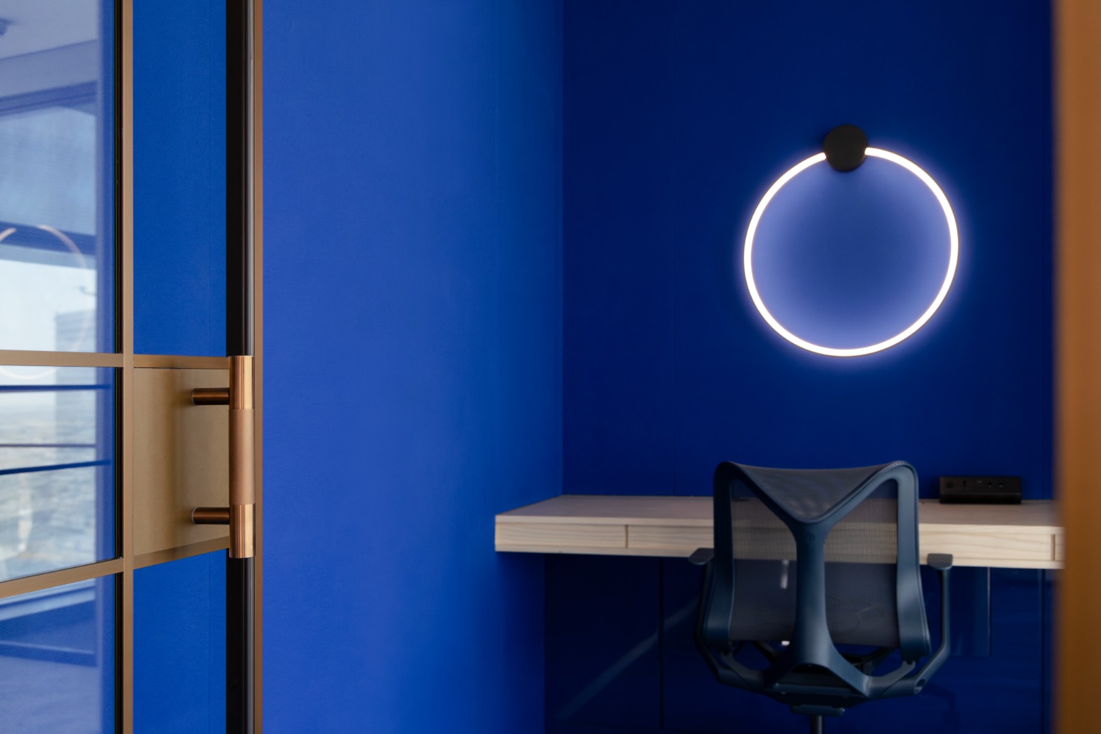 The lighting is dialled down and human-scale to support focus and recharging. Low-level illumination offers visual comfort, wall-mounted ring lights produce ideal lighting for video calls, and acoustic pendants minimise noise for a distraction-free environment.