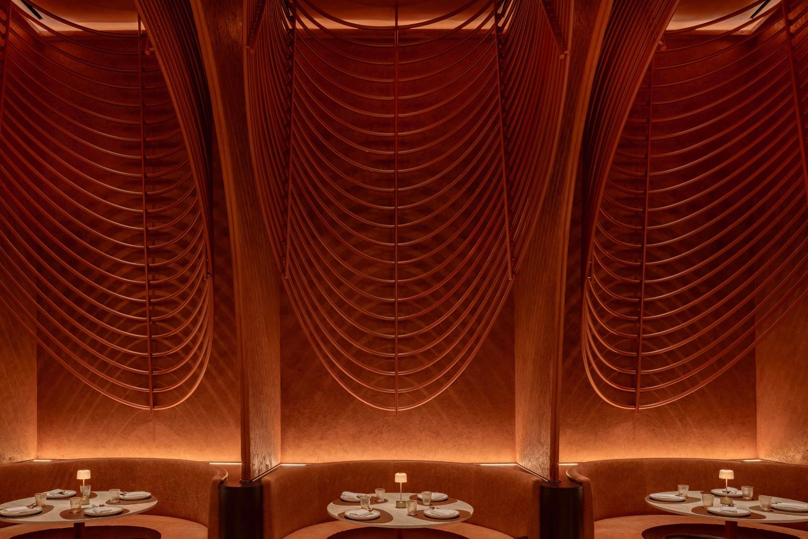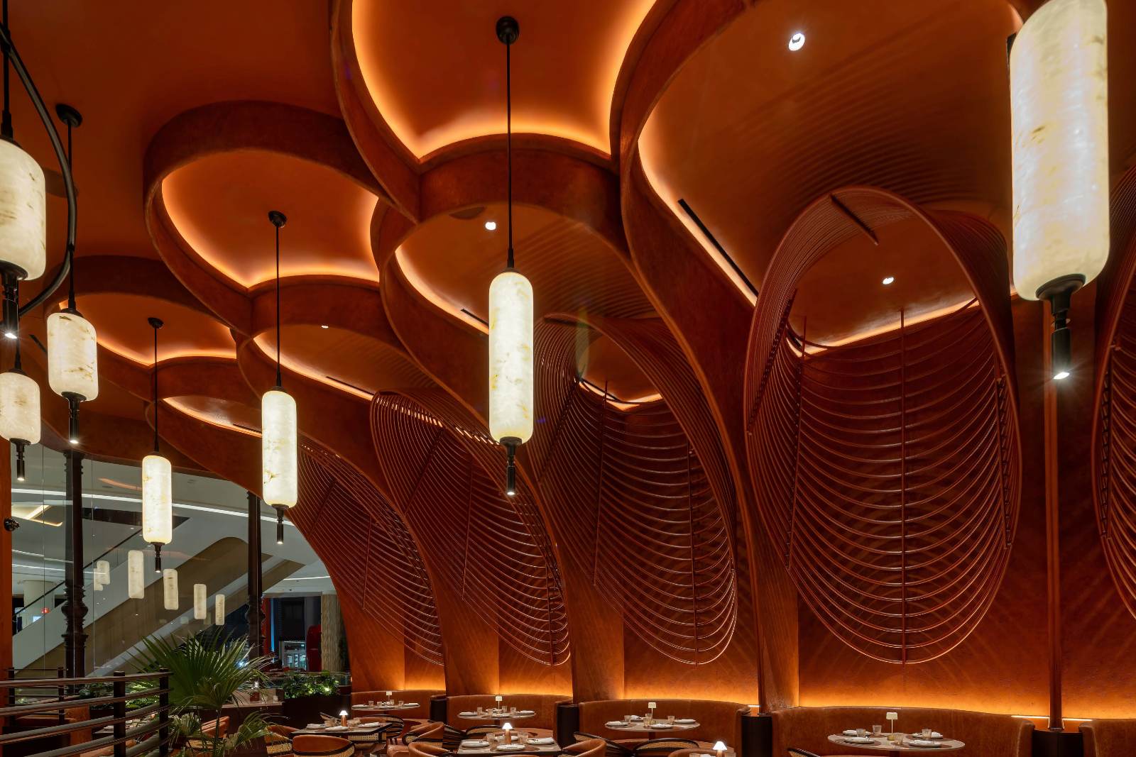 A sculptural feature ceiling dominates the space, echoing the traditional arches and earthy tones of India’s Red Fort. Lines of light were carefully concealed within the metal rings to graze the smooth surfaces of the ceiling, adding depth to the terracotta patina and definition to the architectural curves.
