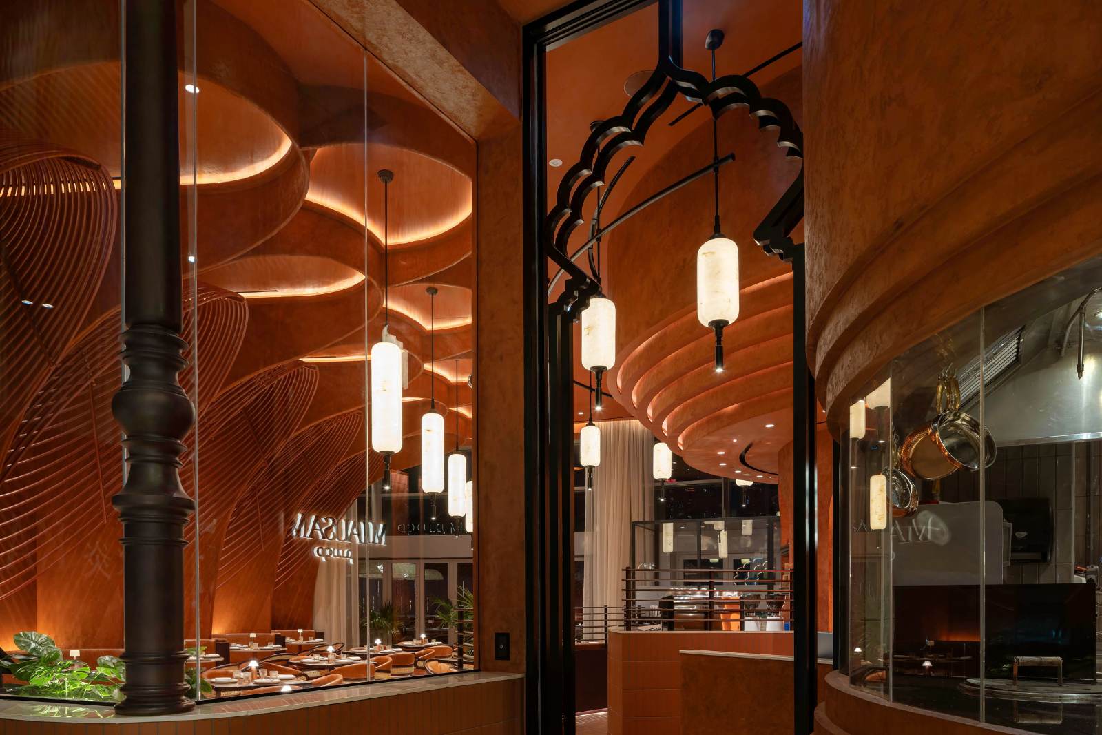 Mausam at The Dubai Mall is an immersive dining concept that takes its cue from the sweeping arches and red sandstone hues of Indian architecture. Designed by 4Space, the restaurant is characterised by warm and inviting spaces, anchored by a dramatic ceiling that pays homage to Red Fort in Delhi – a historic piece of Mughal architecture.