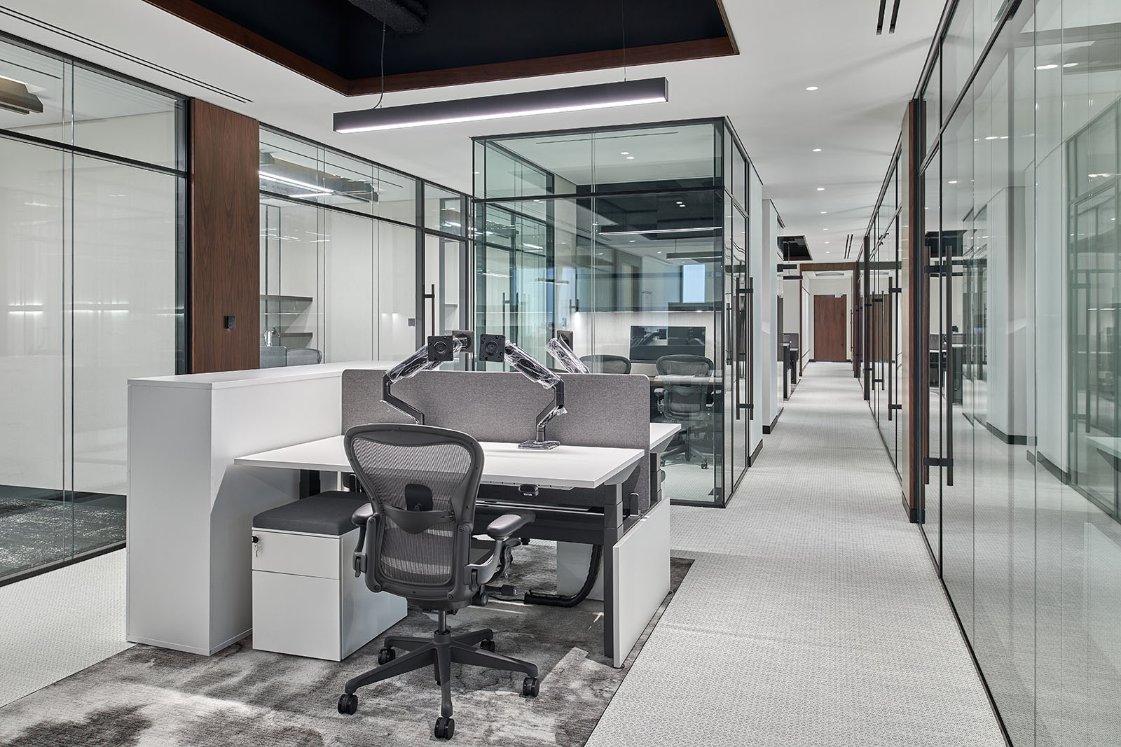 Our lighting solution takes its lead from the interior design, guided by clean lines and rich layers of high-quality, restrained materials, and key architectural details. The design approach centres on encouraging concentration and productivity while creating an invigorating yet inviting atmosphere.