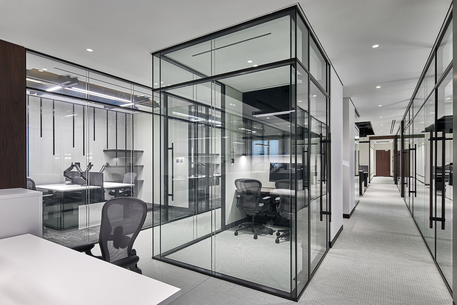 Subtle linear illumination and task-orientated fixtures provide comfortable light levels inside sleek, glass-enclosed portals, supporting focused work.