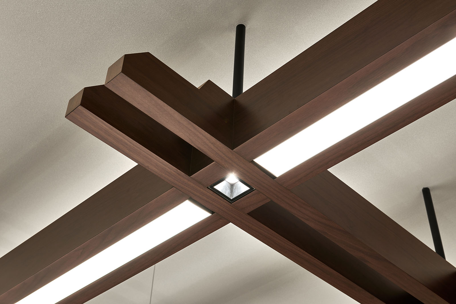 Lighting embedded within dark wooden linear frames creates stylish yet functional focal points. The eye-catching ceiling installations hover above conference tables to provide task lighting, while the warm tone of the timber fosters a collaborative environment among employees and clients.