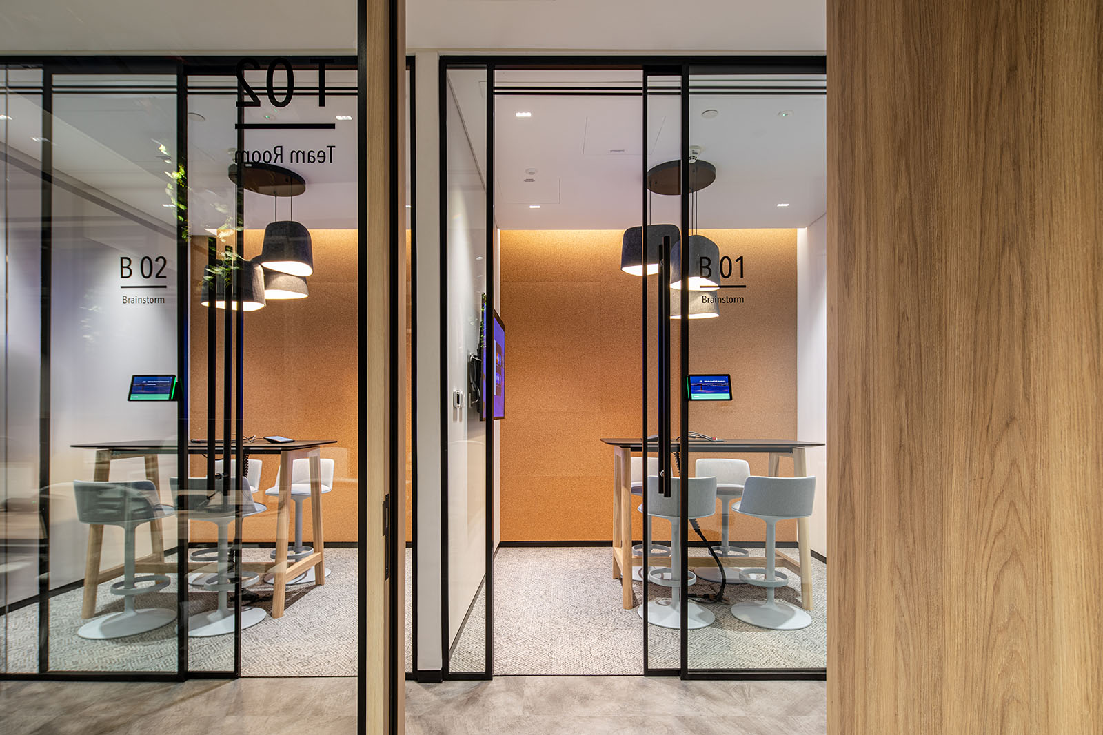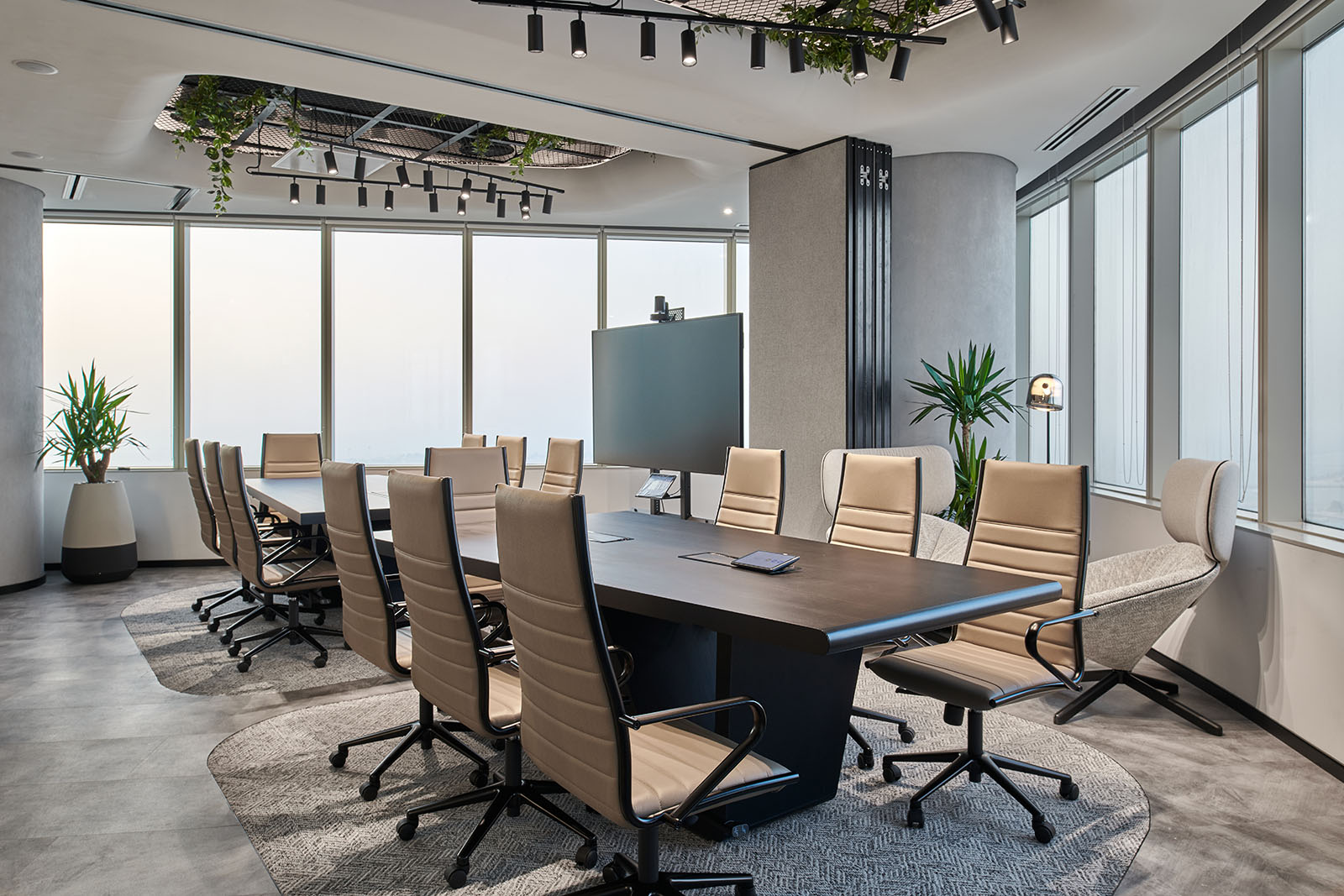 Each space benefits from vertical illumination to brighten walls with screens, minimising contrast ratio. Scene setting lowers the brightness of downlights while raising that of decorative elements, providing functional light levels that effectively illuminate faces for video calls.