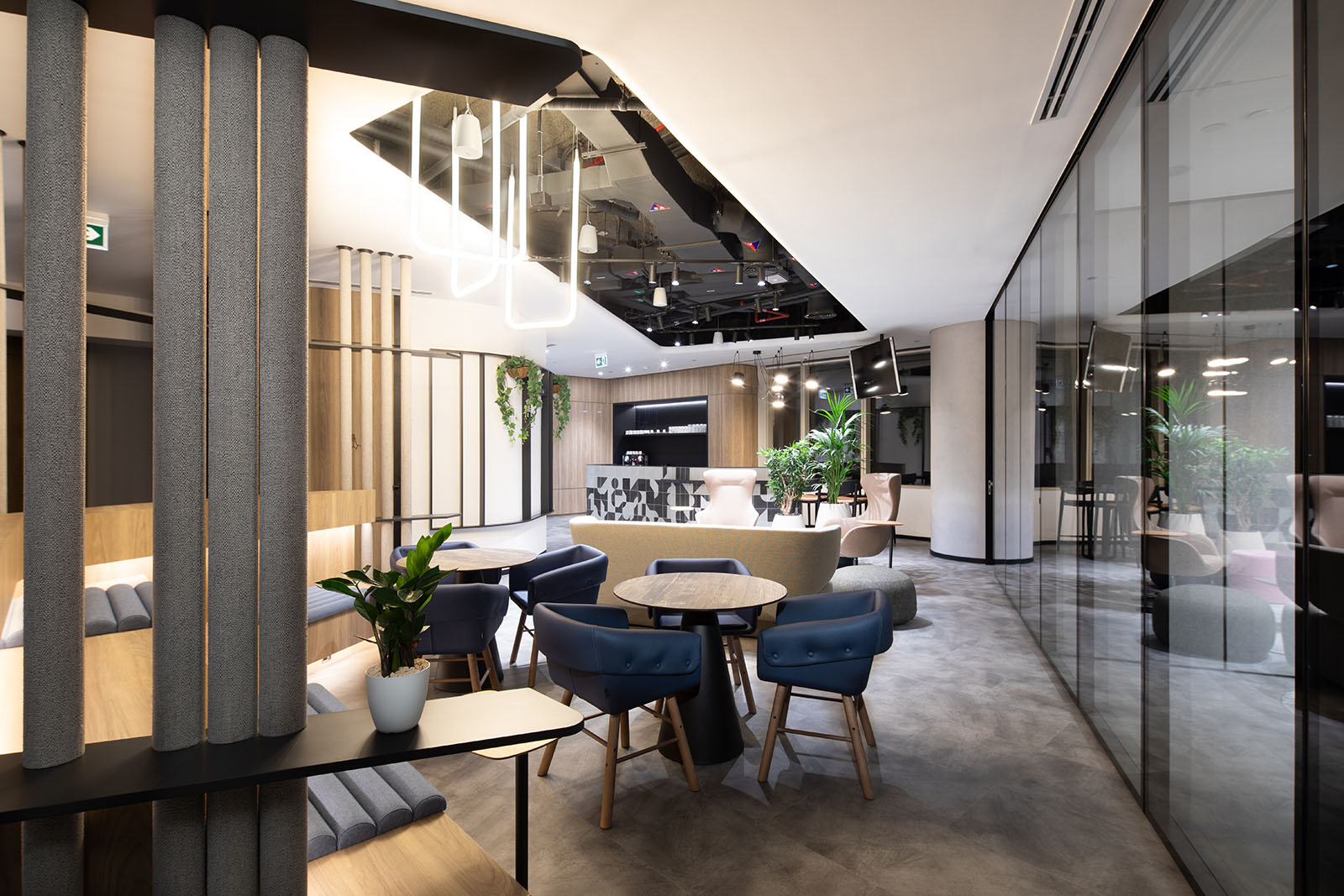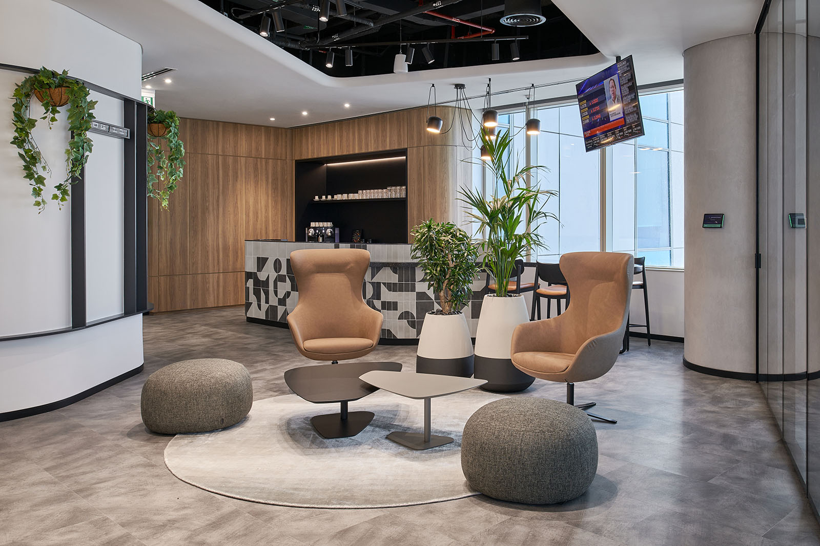 Track and spot fixtures create a foundation of diffused, uniform lighting across open areas, such as reception and hot-desking spaces, enhancing the earthy tones set by soft furnishings and textured upholstery.
