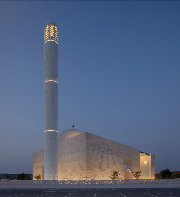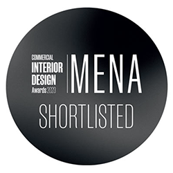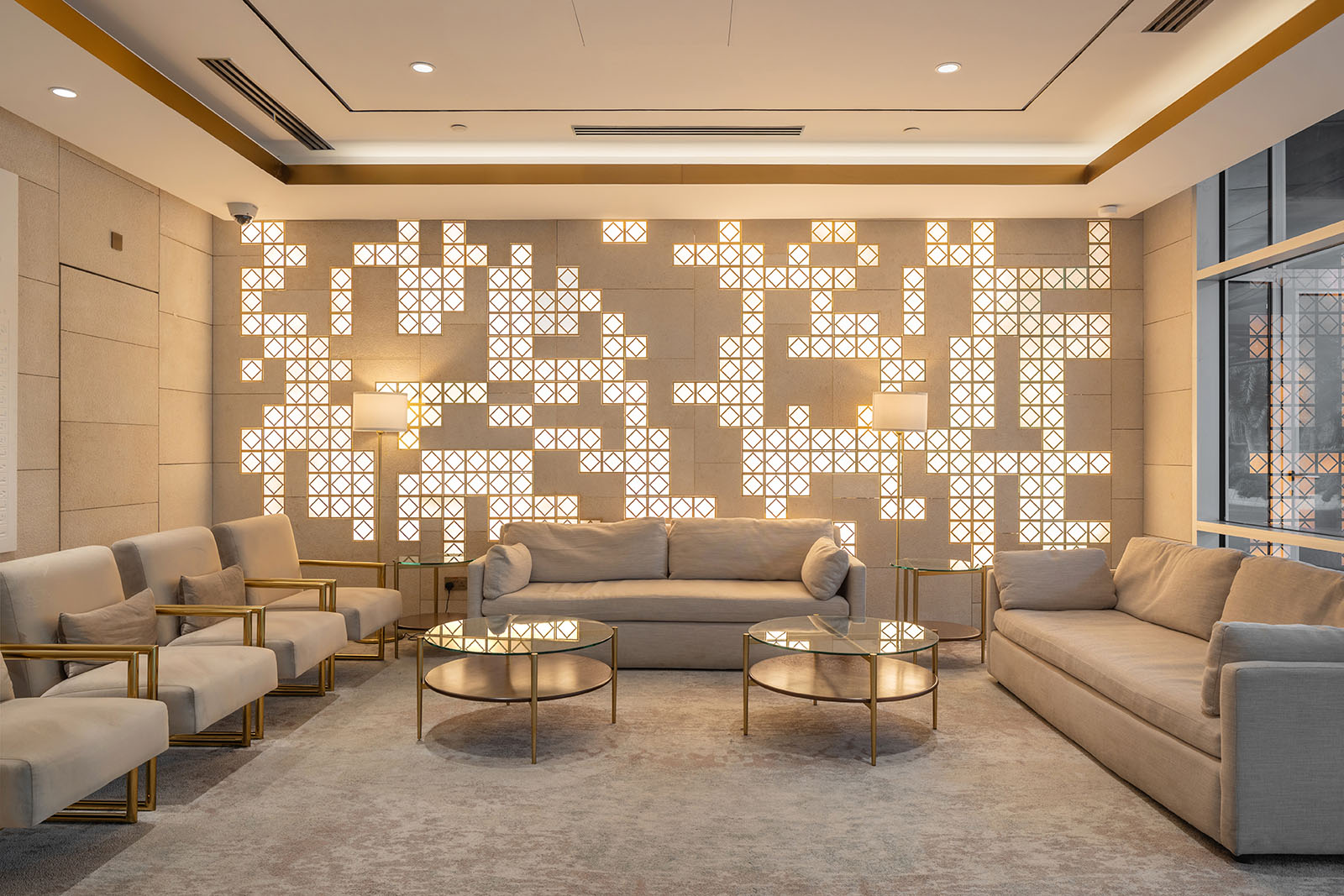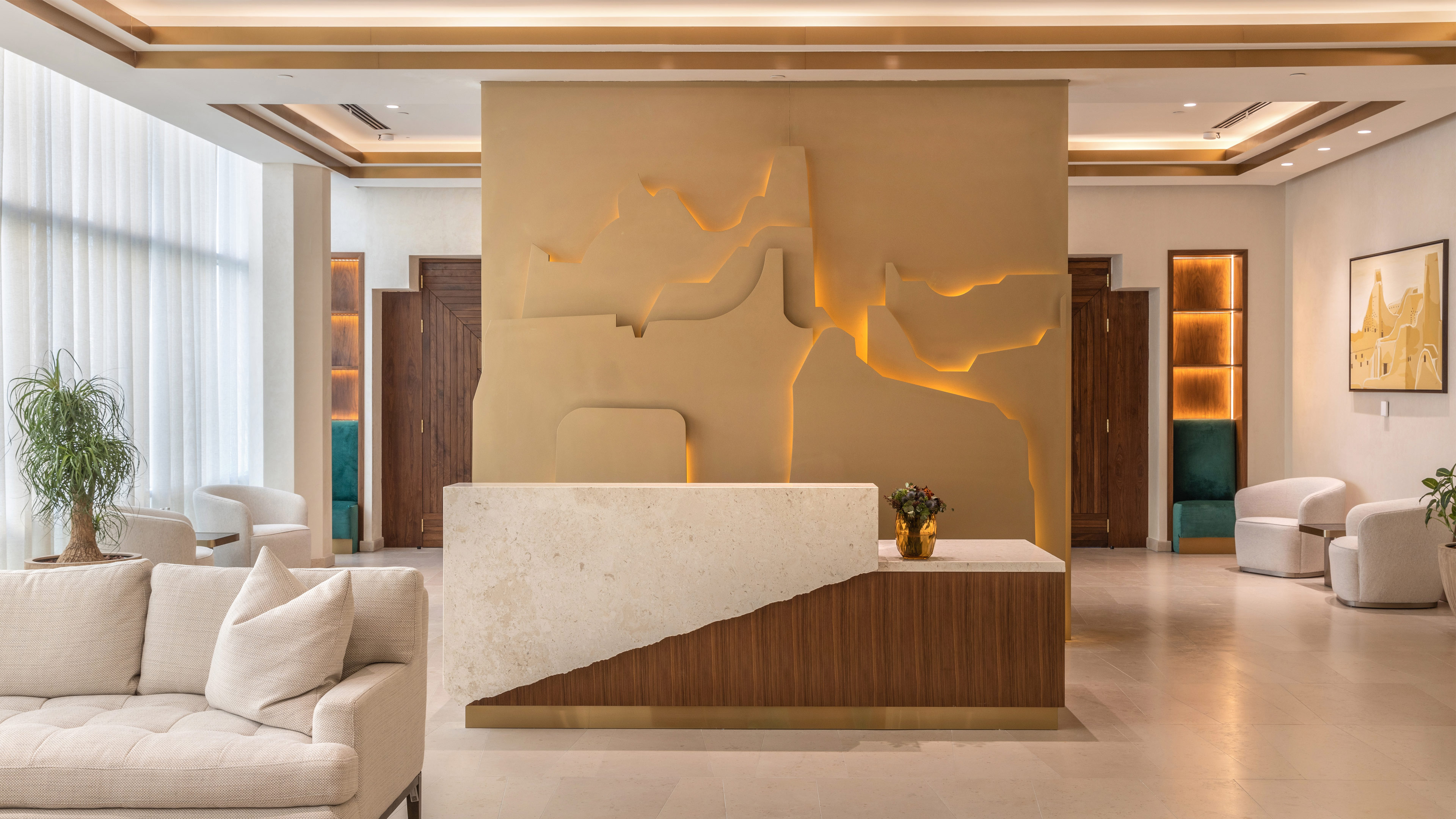 An artistic wall behind the reception desk represents Mada’in Saleh – the ancient rock-carved monuments found in the desert. Concealed diffuse lighting brings depth to the design by highlighting the contours for a subtle sand-toned glow.