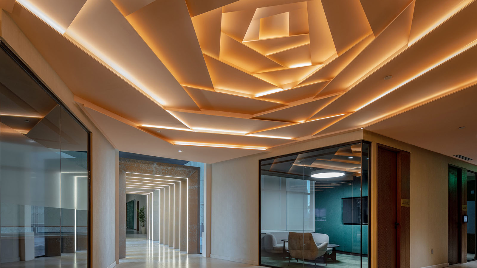Inspired by the desert rose, a dramatic ceiling installation greets VIPs with a unique sense of arrival. Lines of light concealed under each petal highlight the three-dimensional sculpture and create a warm, welcoming effect.