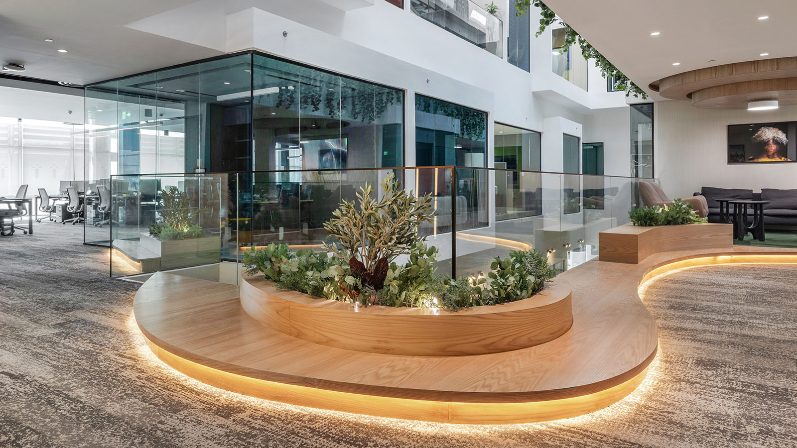 In the light-filled atrium, minimalist step lighting teams with spike lighting among lush planting to complement natural light cascading through – daylight and biophilia were key considerations throughout, so natural and artificial light had to be balanced in each space.