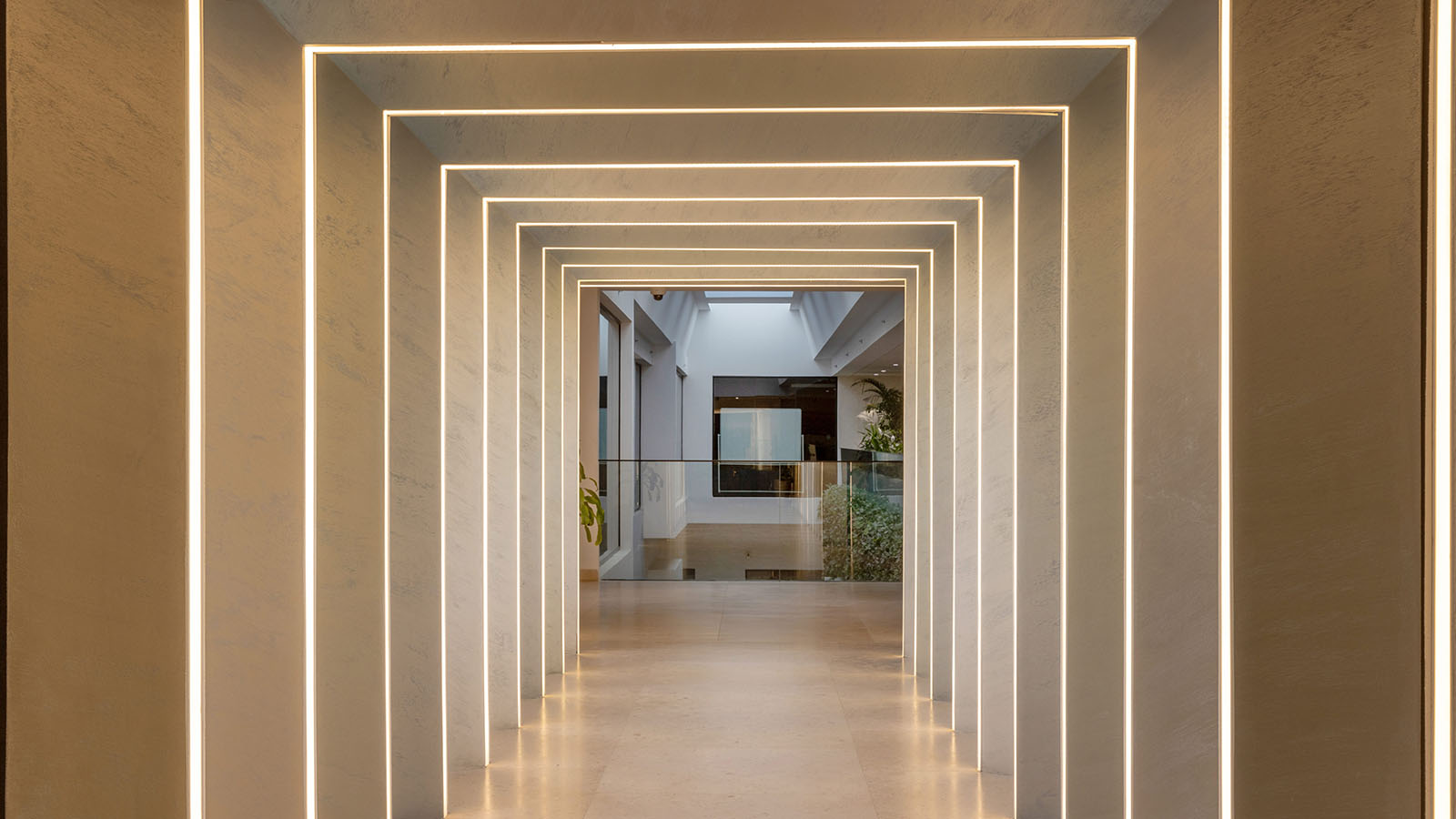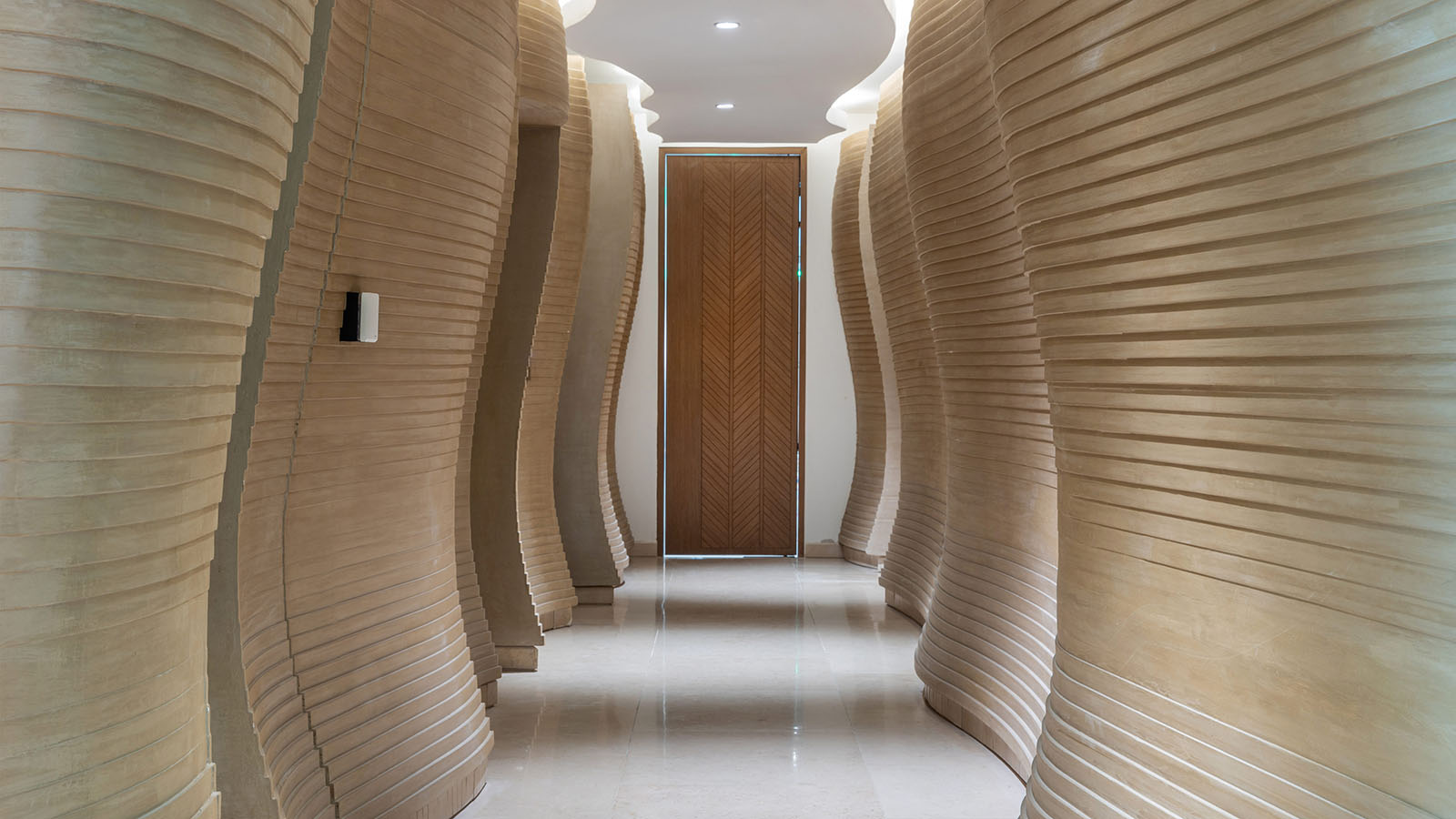 Concealed ceiling illumination grazes light onto the curved silhouettes of commanding sand-toned walls below, drawing attention to their texture and fluidity, transforming a standard corridor into an elevated experience.
