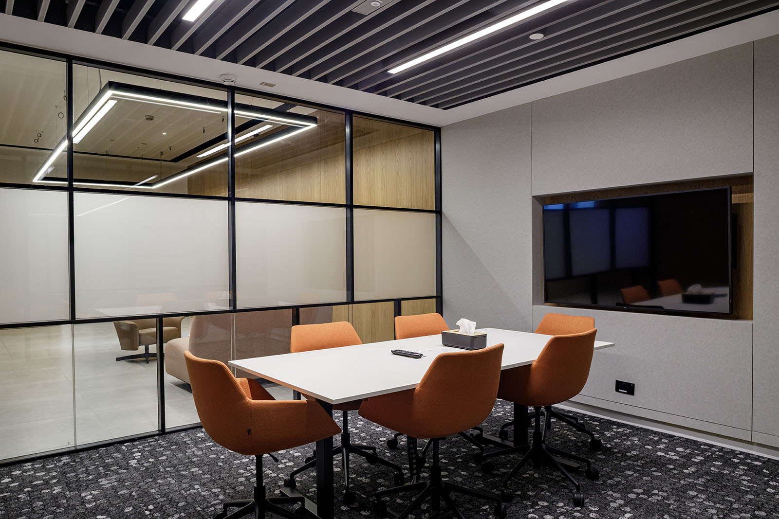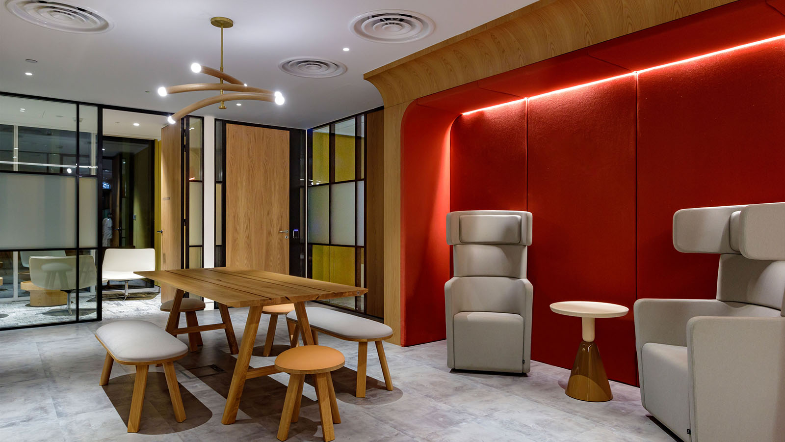 The meeting rooms feature a mix of linear profiles, downlights, and wall lights, optimised for video conferencing, presentations, or informal one-to-ones. In the conference room, the lighting is seamlessly integrated with audiovisual systems to produce a collaborative and focused atmosphere.