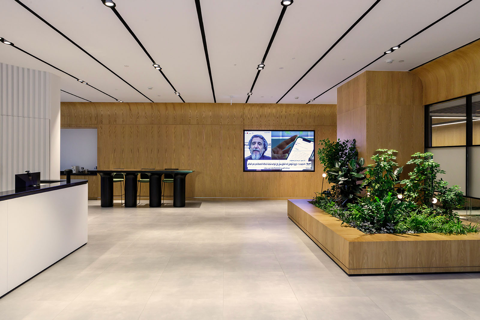 Adjustable downlights were embedded in the bold architectural lines of the ceiling in the reception, delivering uniform brightness across the minimalist space. Spike lights emit a soft glow amongst the planted greenery, accentuating the biophilic elements.