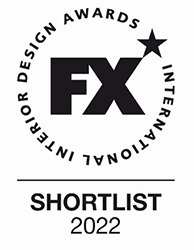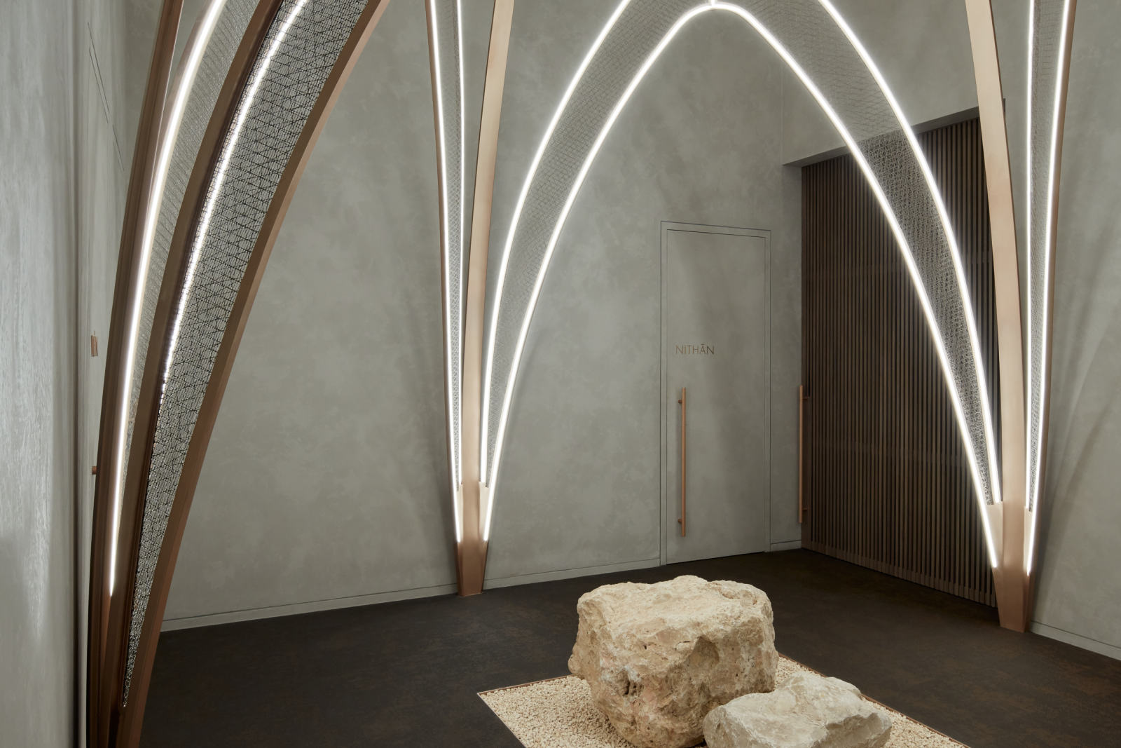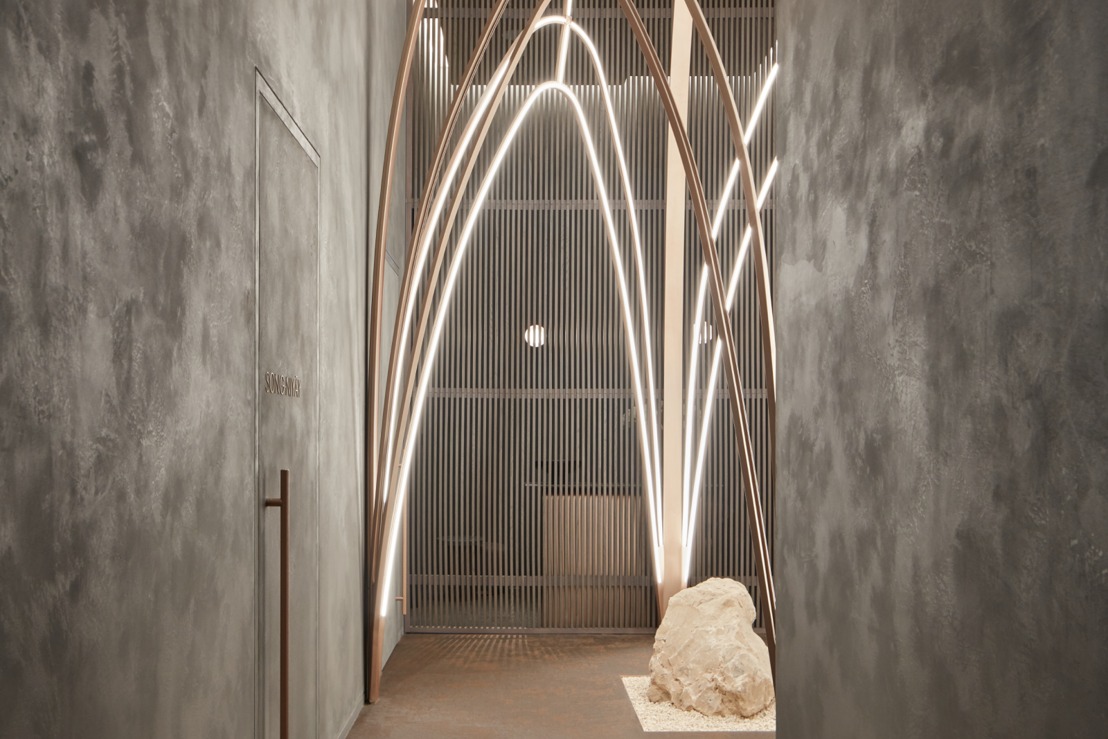 Large illuminated arches form a bold feature in the courtyard, bringing movement and theatre to the space. The arched theme continues in reception, where discreet lights tucked into arch-shaped shelving add a layer of accent.