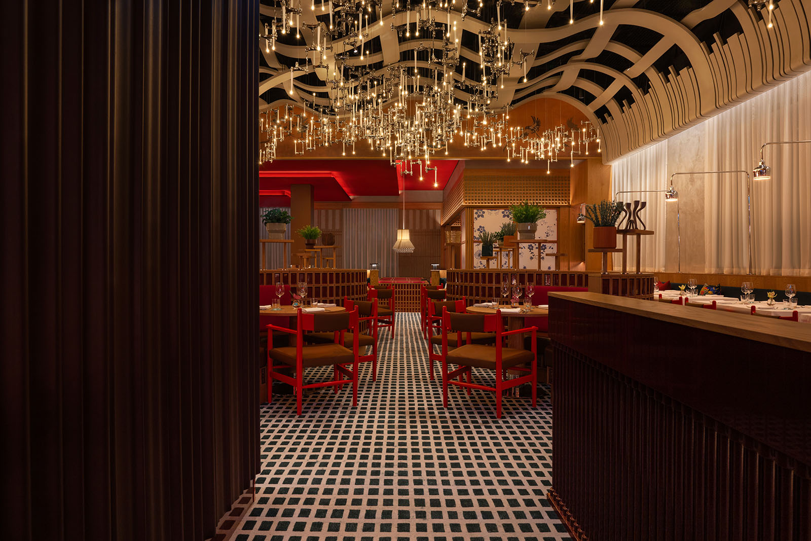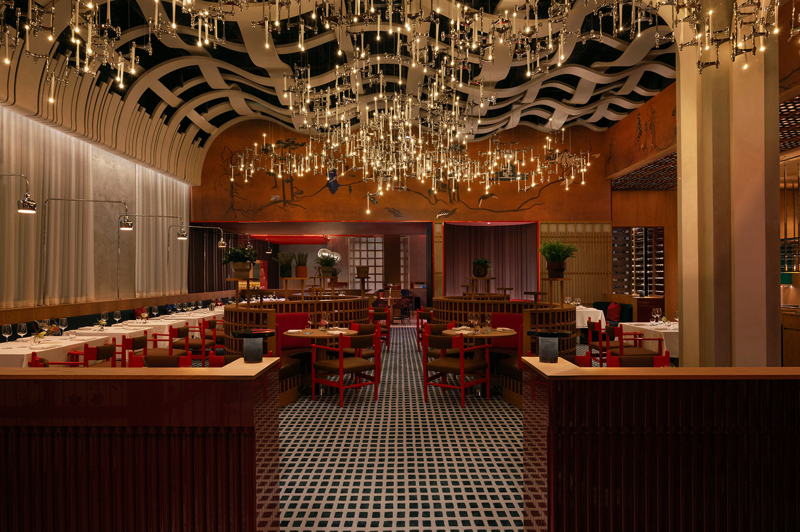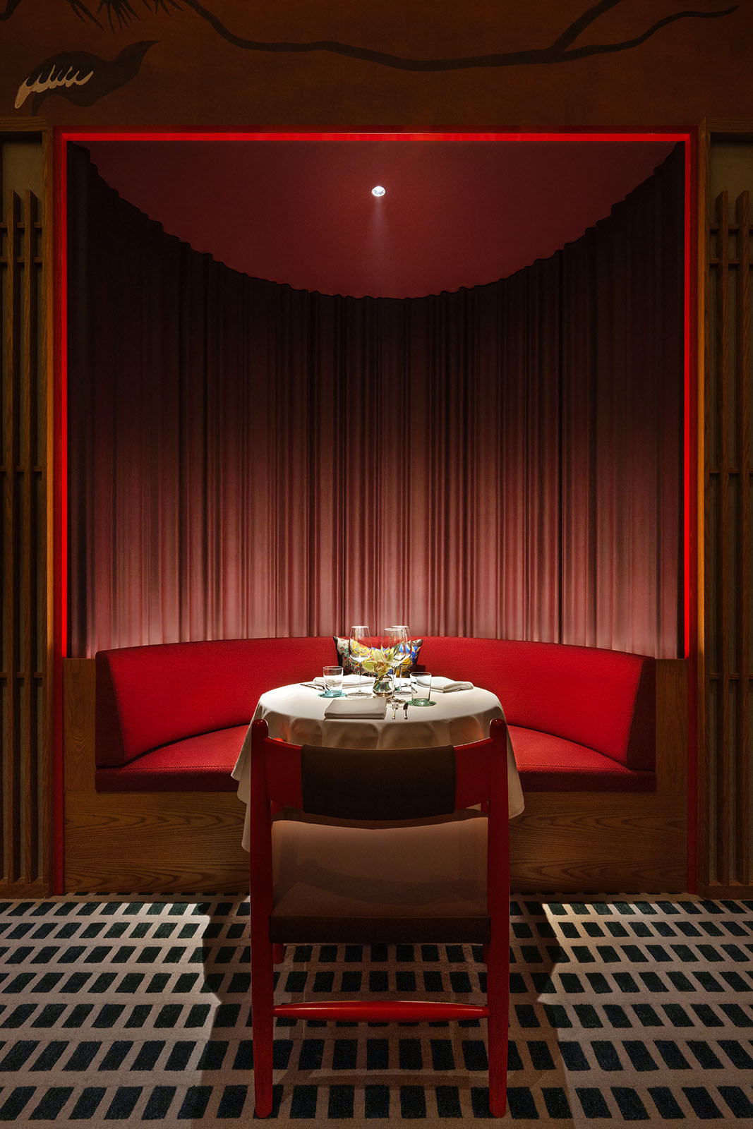 A single downlight above the all-red dining booth produces a subtle yet striking beam of light – all eyes are drawn to the drama of the intimate nook. In the private dining room, light is discreetly woven into the architecture highlighting the decorative ceiling and creating a soft, radiating glow.