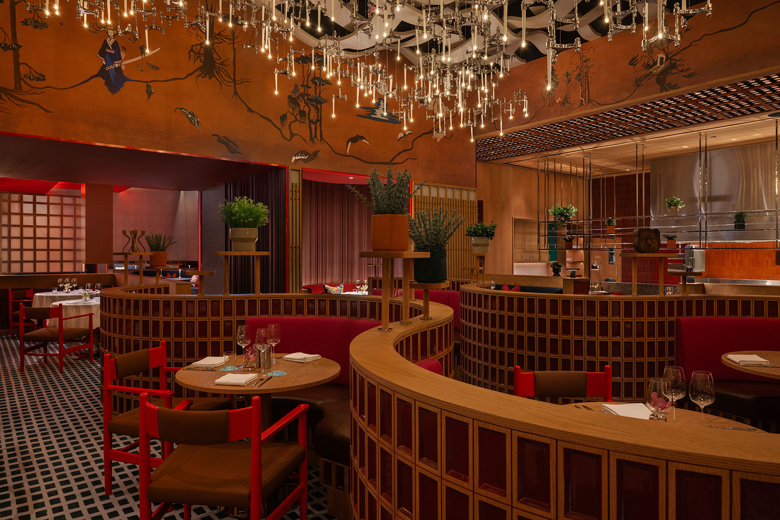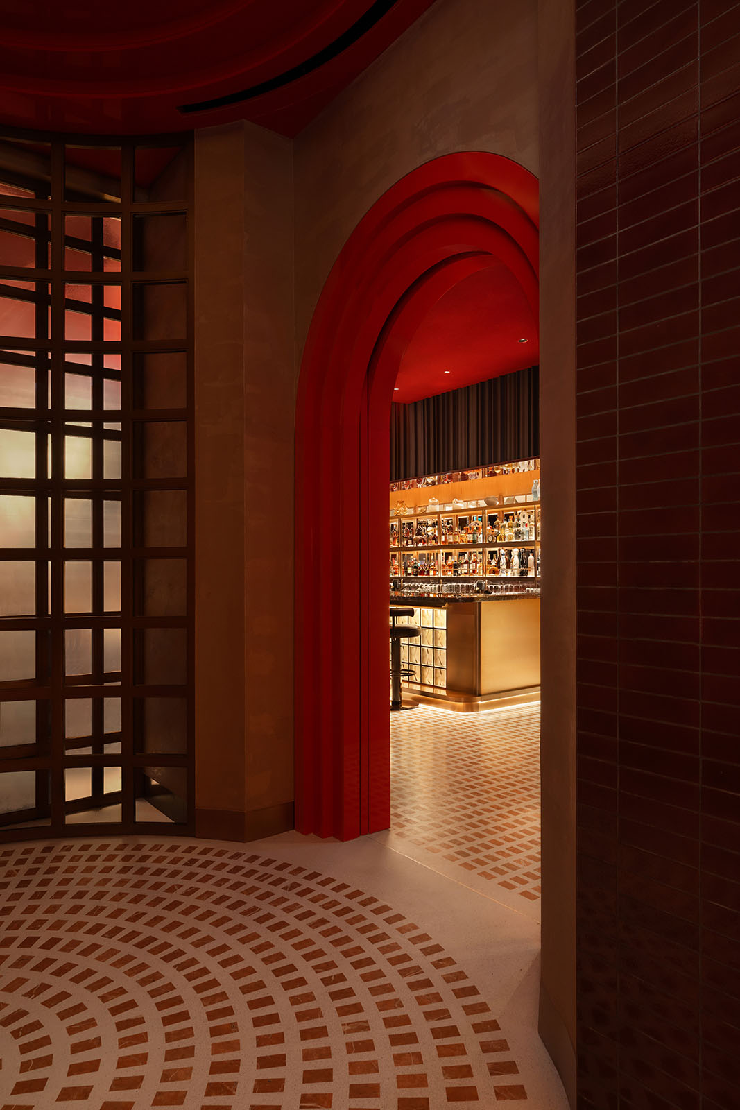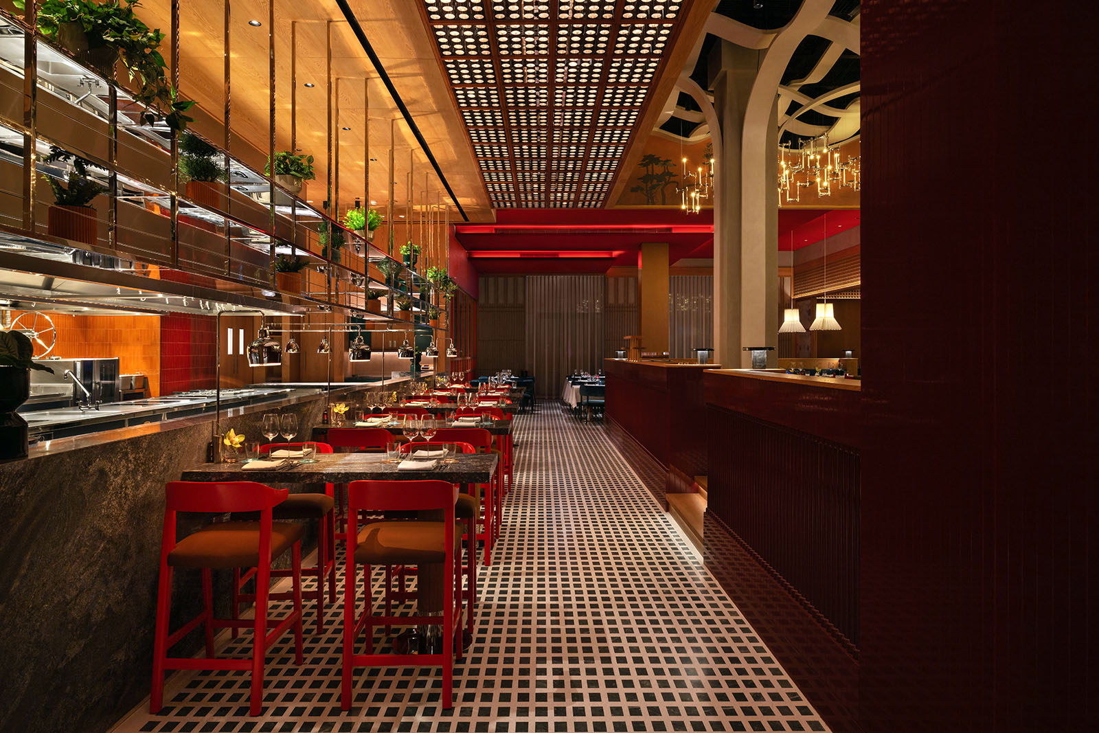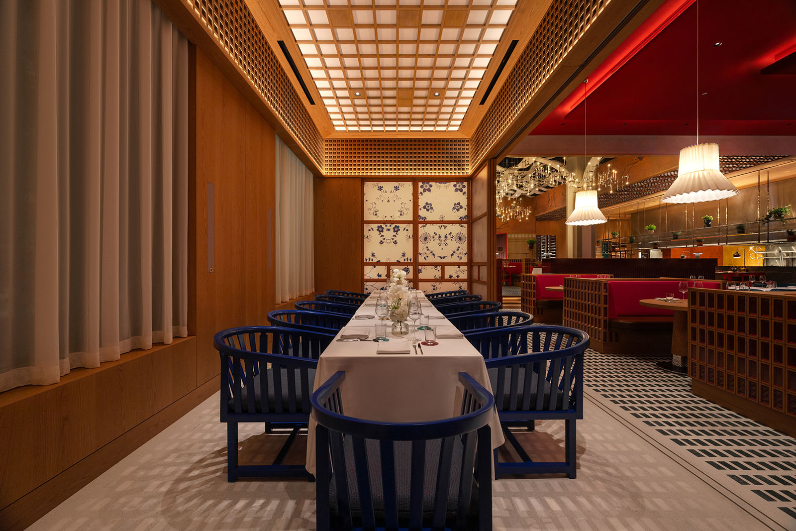 A single downlight above the all-red dining booth produces a subtle yet striking beam of light – all eyes are drawn to the drama of the intimate nook. In the private dining room, light is discreetly woven into the architecture highlighting the decorative ceiling and creating a soft, radiating glow.